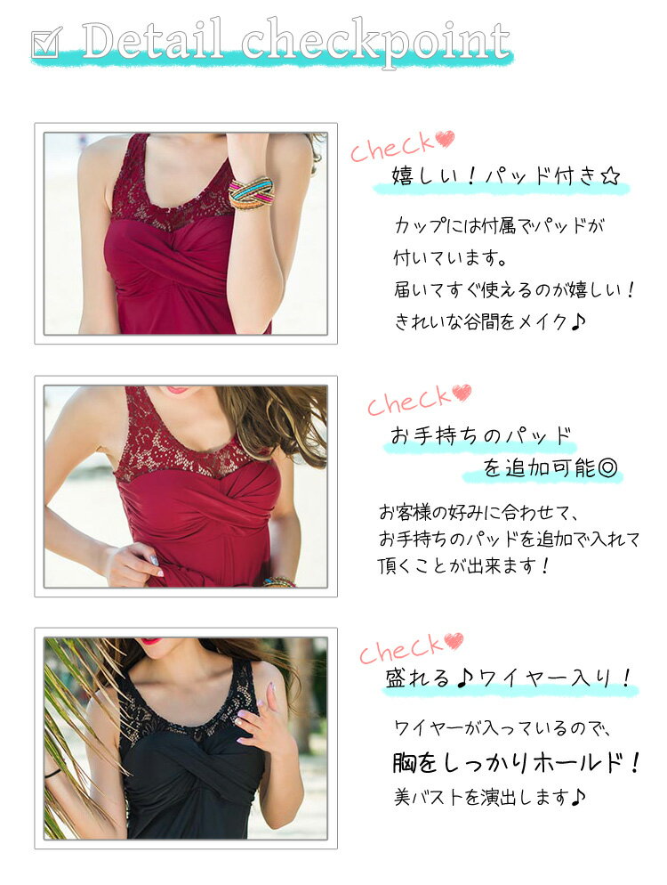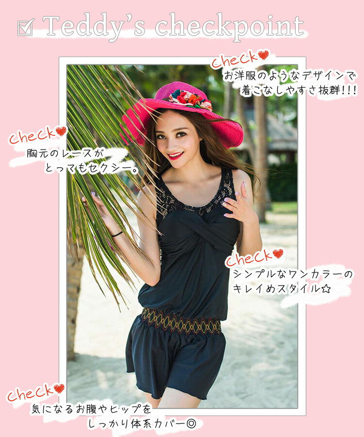 ●素材:ナイロン 84%、ポリウレタン 16% ●当日正午12時までの注文で即日発送水着レディース 体型カバー タンキニ ワンピース シンプルなワンカラーのキレイめスタイルの水着です! お洋服のようなデザインで着こなしやすさ抜群! 胸元のレースがとってもセクシーなデザインです☆